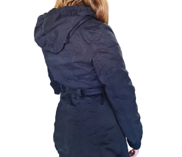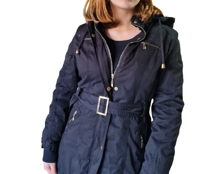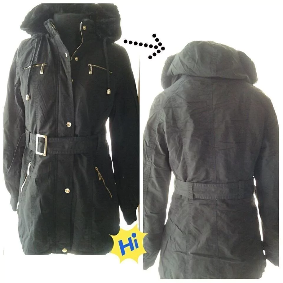 Campera de gabardina, forrada con piel y capucha desmontable, negra, talle M (i010418)